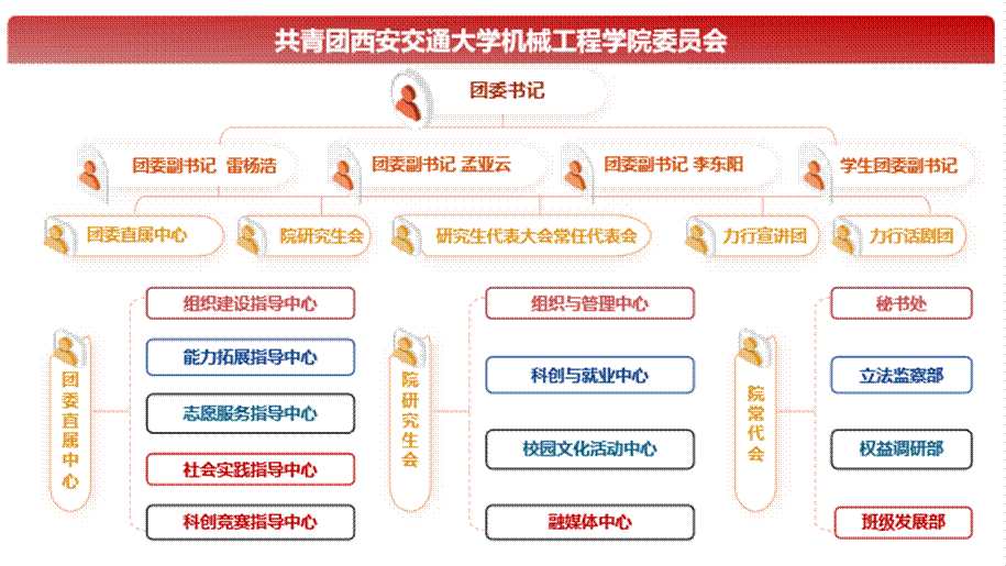 院团委设置团委书记1名、副书记3名、学生副书记5名。院团委下设5个直属中心,负责机械工程学院团组织的思想引领、组织建设、科创实践与考核评优等工作,为学院基层团组织提供指导和服务。同时指导学院研究生会、研究生代表大会常任代表会和力行宣讲团开展工作。各直属中心主要职能如下: