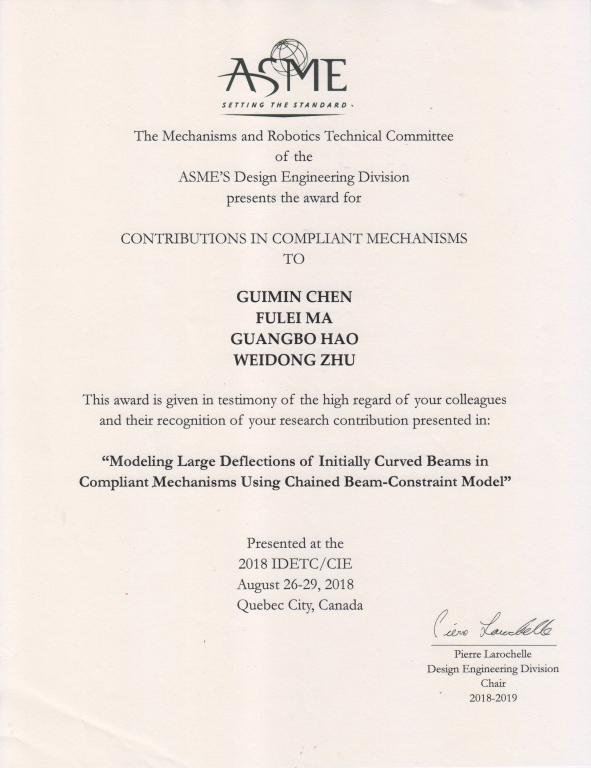 在加拿大Quebec举办的2018 ASME International Design Engineering Technical Conferences & Computers and Information in Engineering Conference上,机械工程学院机器人与智能系统研究所陈贵敏教授等的论文“Modeling Large Deflections of Initially Curved Beams in Compliant Mechanisms Using Chained Beam-Constraint-Model”获得美国机械工程师学会机构学与机器人技术委员会的Compliant Mechanisms Award(柔顺机构学奖,奖金1000美元)。本篇论文是2018年ASME柔顺机构奖项的唯一获奖论文。