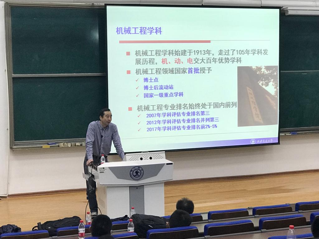 随后,机械工程学院教学副院长段玉岗教授为新生作入学教育报告。他首先对新生的到来表示衷心的祝贺和热烈的欢迎。接着,他带领同学们了解了机械工程学院的发展历程和专业概况,详细介绍了本科生的培养体系和教学管理规章制度,并特别对培养过程中学生关注的几个问题进行了详细解答。同时,他告诉新生们,大学是没有上锁的保险箱,提醒大家要做好充分的思想准备,寻求和建立人生目标,树立为自己学习的思想,养成自主学习的习惯。最后,他对新生提出了自己的建议和希冀,要多参与,多找兴趣点;多实干,锻炼学习力;多交流,不断完善自己;多“异想天开”,实现个人与社会价值。他希望同学们通过自身努力及大学培养,成为卓越工程师及领军人才,促进中国从制造大国向制造强国的转变。