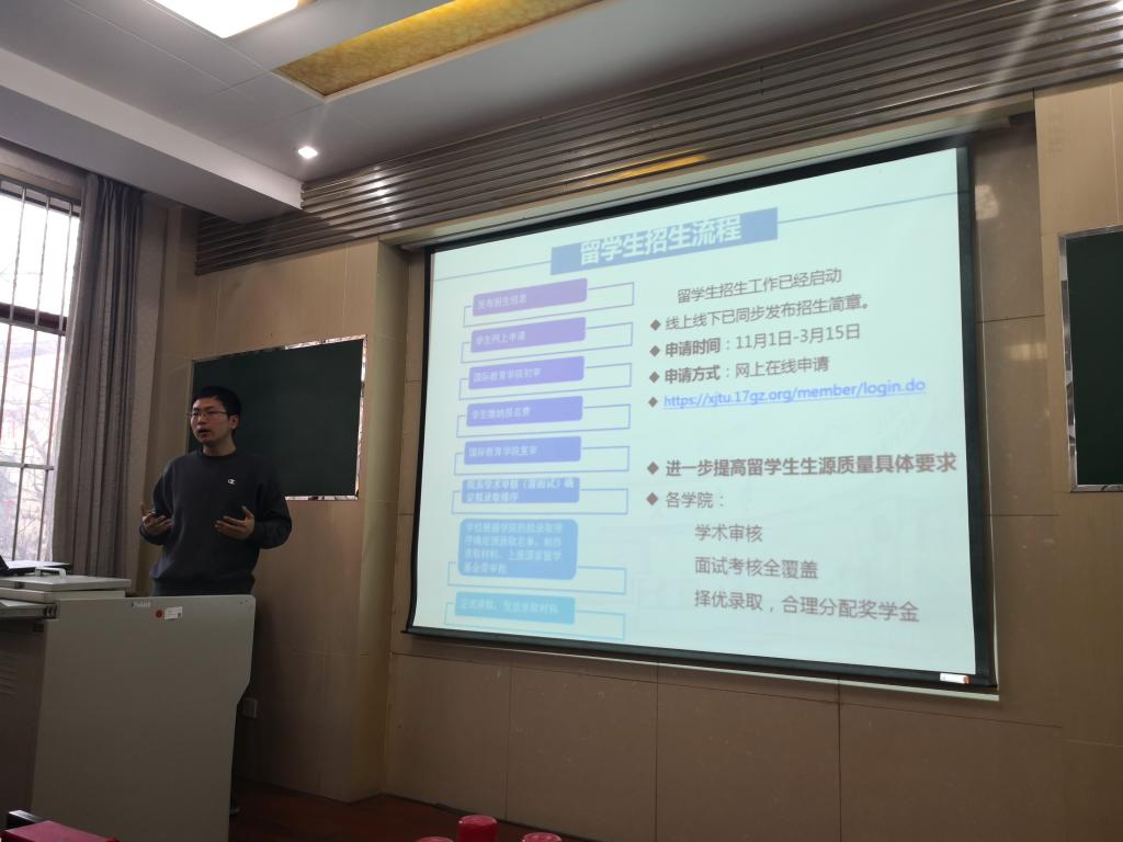 接着,温广瑞教授代表国际教育学院全面介绍了全校留学生近年来的招收情况,他特别强调,世界一流高校的留学生数量一般占全校总学生数的10%以上,而目前我校还需要加大力度,提升留学生占比;此外,将各学院横向比较来看,万象城awc官网登录入口有极大的潜力招收和培养更多的留学生,为建设“双一流”做出贡献。为了使老师们更加透彻地理解留学生招收细则,国际教育学院招生办马腾老师,向大家介绍了从学生开始申请到学生来校报到所需完成的步骤和申请流程,留学生奖学金的设置,并解答了现场教师在实际工作中所遇到的困惑。
