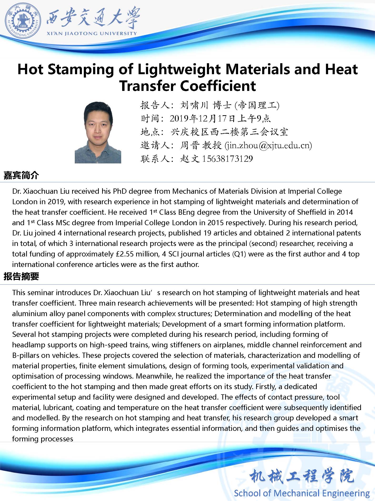 应国际机械中心周晋教授邀请,毕业于英国帝国理工学院的刘啸川博士将于2019年12月17日带来题为“轻量化结构快速成型工艺热传导研究”的学术交流会,欢迎各位老师、同学前往聆听、现场交流。