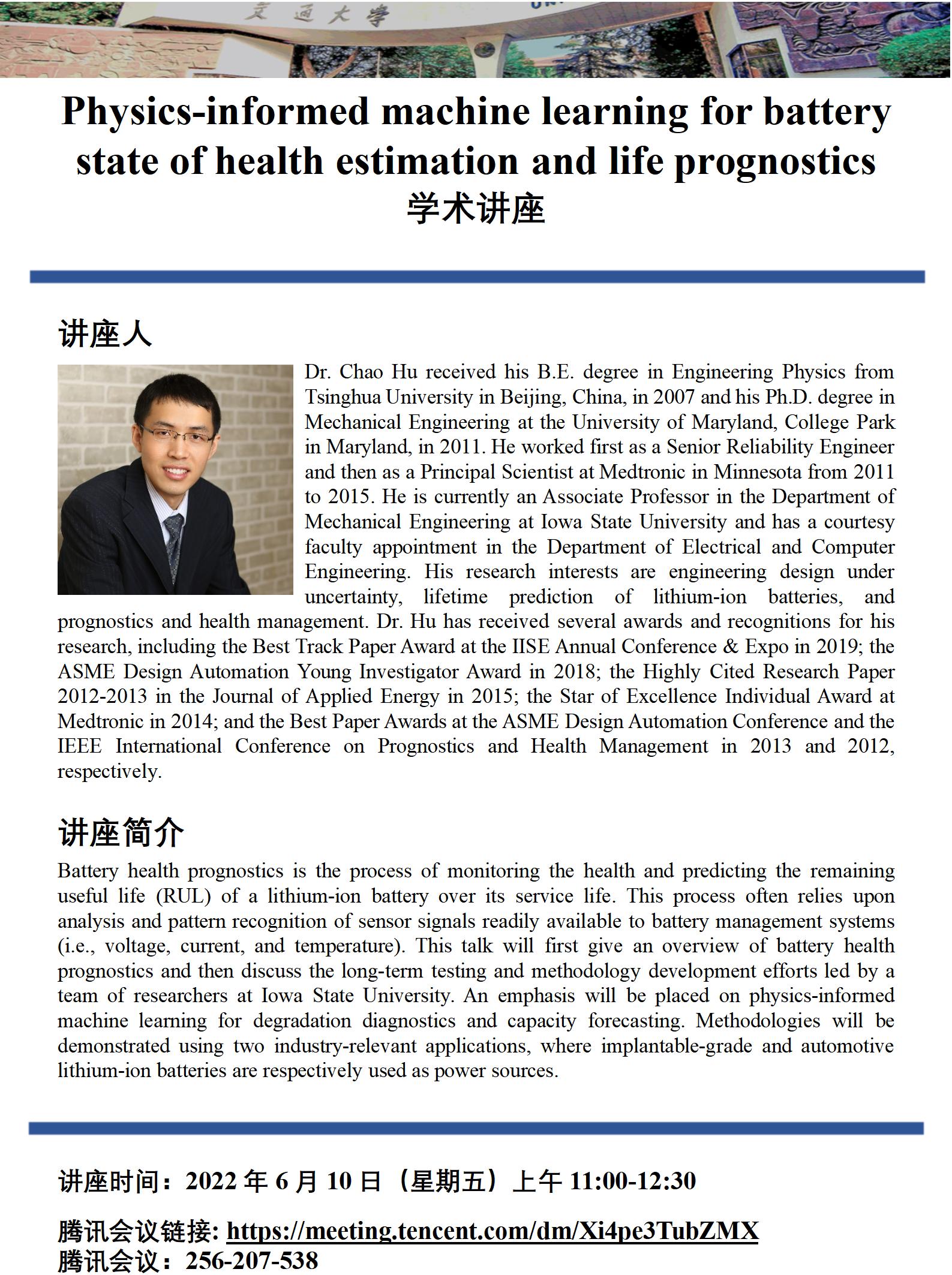 线上学术讲座通知--"Physics-informed machine learning for battery state of health estimation and life prognostics"