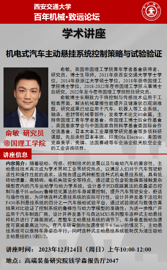 讲座题目:机电式汽车主动悬挂系统控制策略与试验验证