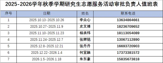 2、学院研究生志愿服务活动审批小组(审批小组成员名单见附件3)收到相关文件后将及时进行活动审批并反馈,若活动负责人在提交申请后的第二天22:00前未收到活动反馈,请联系管理人员进行咨询,故各组织的志愿活动负责人应在活动开展至少七个工作日前(留出充足时间)将活动申请书进行提交审核。