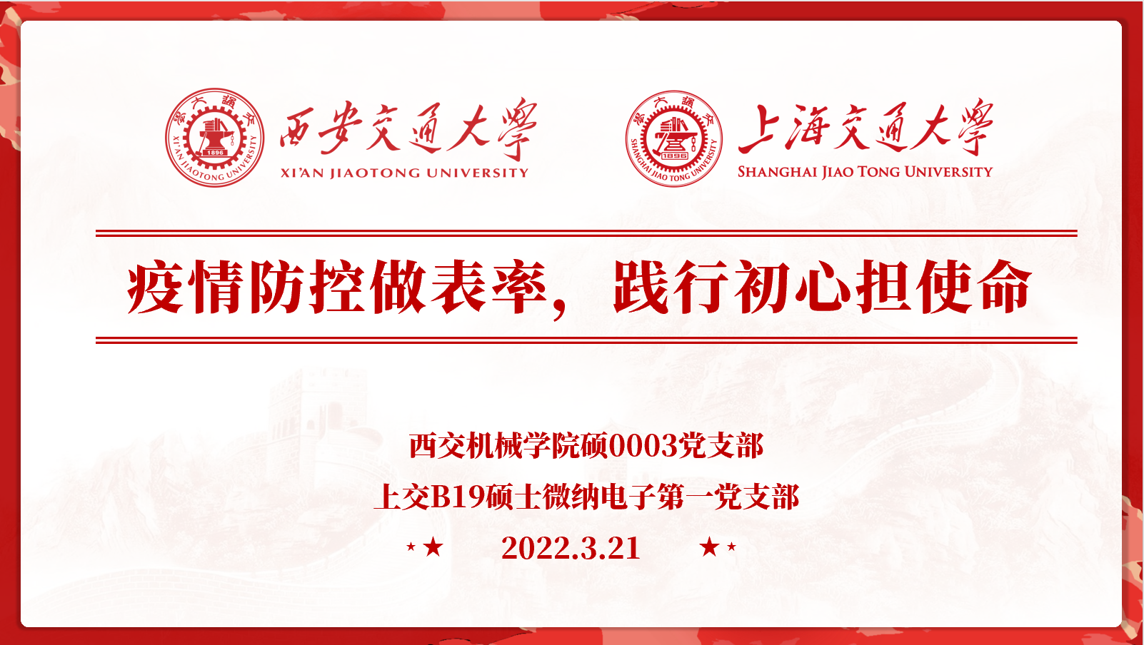 当前国内疫情形势严峻,西安和上海两座城市都处于疫情之中。因此在3月21日晚,万象城awc官网登录入口万象城awc官网登录入口硕0003党支部和上海交通大学B19硕士微纳电子第一党支部开展共建交流活动,相互分享学习抗疫过程中形成的宝贵经验和心理感受,两支部全体成员线上参加。