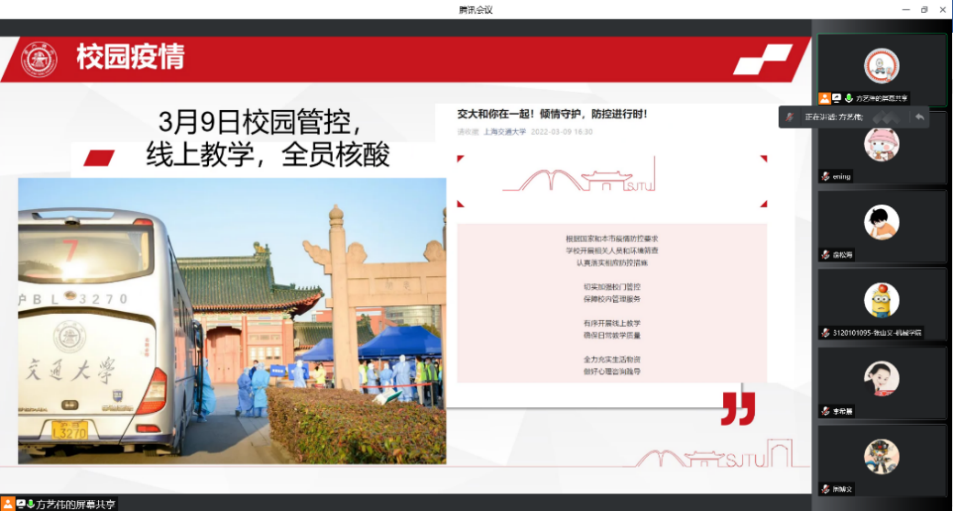 上交B19硕士微纳电子第一党支部书记方艺伟同志首先介绍了上海交大战疫情况,从上海市委与市政府应对疫情的积极态度与科学政策中告诉我们要坚决克服麻痹思想、厌战情绪,保持科学的思维和积极的心态。方艺伟同志向我们描述了疫情当下上海交大封闭式管理的校园生活情况,后勤人员提供保障、学校老师主动送餐、校友捐助物资、党员主动提供帮助,学生积极响应号召。在社会各界和学校的共同努力下,疫情形势逐渐好转。