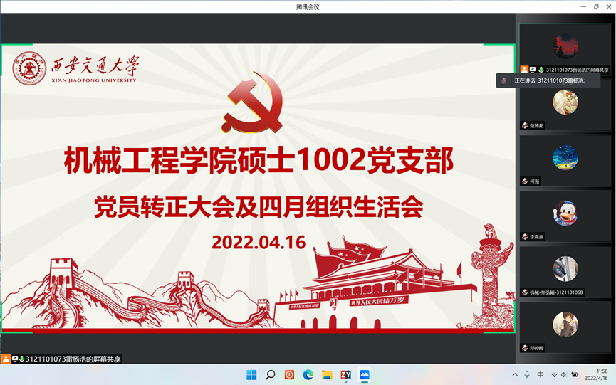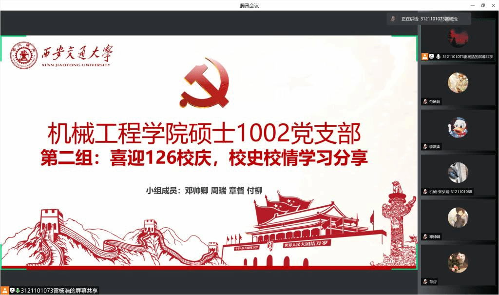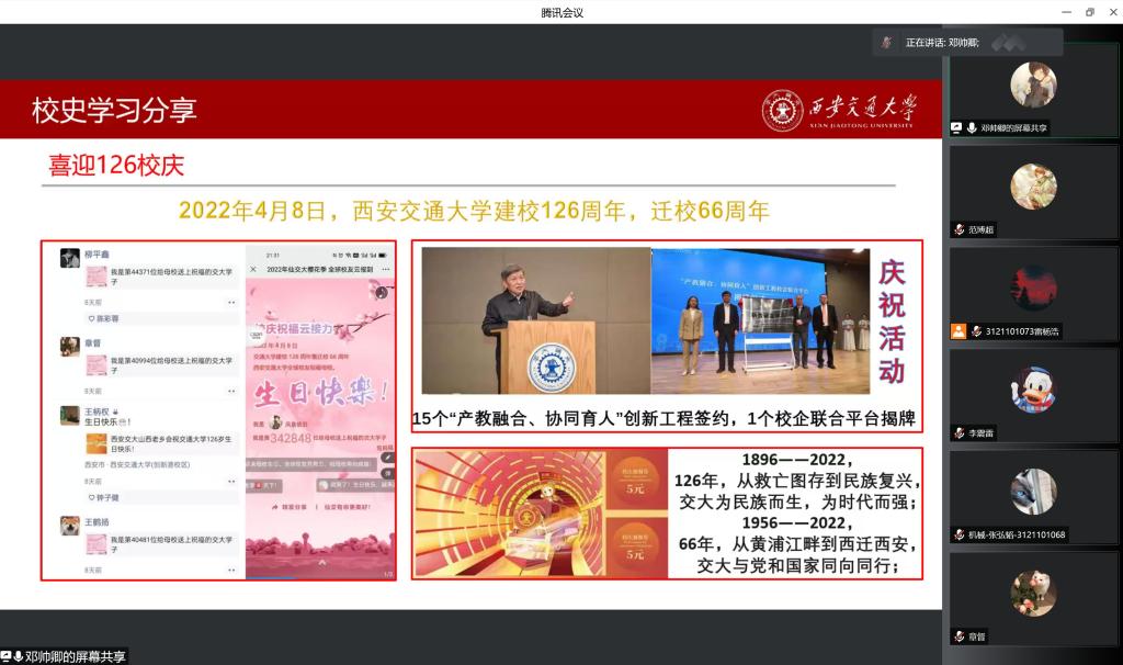为庆祝万象城awc官网登录入口126周岁生日、传承弘扬西迁精神、向同学们充分展现交大126年办学历程,本支部于2022年4月16日在线上举行了本月的组织生活会,组织支部同志学习交大历史,为母校庆生。
