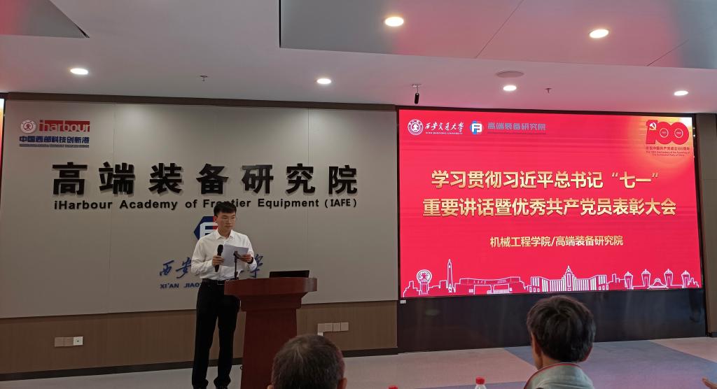 为学习贯彻习近平总书记在庆祝中国共产党成立100周年大会上的重要讲话精神,表彰在过去一年工作、学习中涌现出来的先进个人,动员全院各级党组织和广大党员响应党中央号召,坚定信心、抢抓机遇、乘势而上、奋勇争先,7月9日下午,机械工程学院学习贯彻习近平总书记“七一”重要讲话精神暨优秀共产党员表彰大会在高端装备研究院钱学森报告厅举行。参加此次大会的有机械工程学院党委书记王朝晖、党委副书记张敏、党委委员张新功、党委秘书杨彬,学院研究生辅导员王芬、张喜红、杨江坤、苏宇以及学院各系所党支部书记、支委,党员代表和获表彰的老师和同学们。大会由机械工程学院辅导员杨江坤主持。