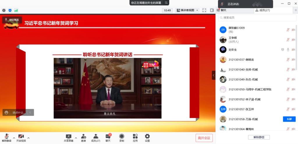 接下来由刘冬生同志带领大家一起学习了2022新年贺词。和新年贺词“金句”迭出,充满信心与力量,充满责任与担当,充满情怀与梦想,温暖人心、感人至深、催人奋进。在新年伊始,我们一起感受习主席在新年贺词中的这份深情,在温暖和祝福之中一起迎接新的开始和更加美好的未来。刘冬生同志在分享时说道:作为一名学生党员,尤其是当下疫情时期,我们更应该以身作则,争做志愿者,帮助身边的同学;同时我们也应该具有广阔的胸襟和开阔的视野。站在新的历史起点上,我们定能战胜各种艰难险阻,创造更加灿烂的辉煌。