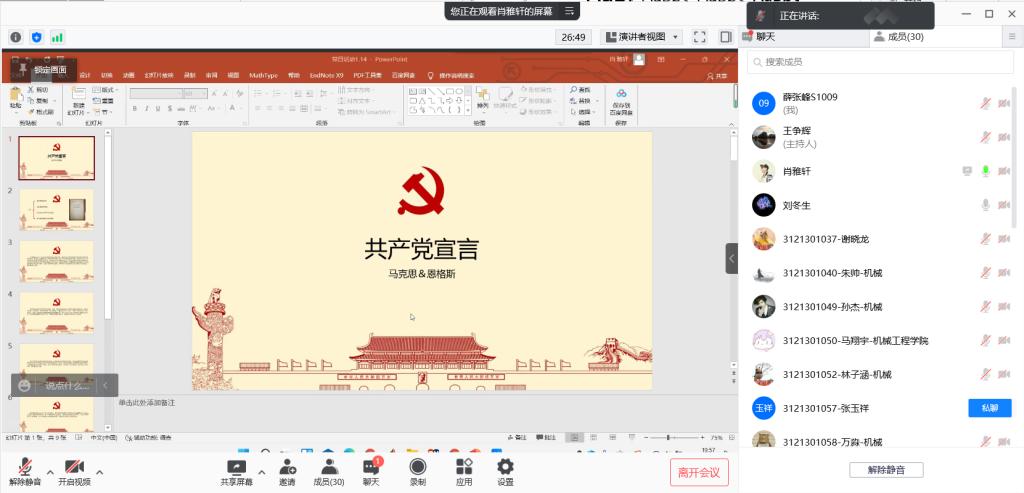 然后由肖雅轩同志为我们分享了《共产党宣言》这本书,该书用鲜明透彻的语言阐述了一个新的世界观,为认识人类社会发展提供了科学的方法论,亦为无产阶级革命提供了行动指南。经过近百年的不懈努力,党所领导的事业已经取得了举世瞩目的成就,今天我们比历史上任何时期都更接近、更有信心和能力实现中华民族伟大复兴的目标。《共产党宣言》是共产党人的精神财富,它所蕴含的无私的奉献精神、彻底的斗争精神、豪迈的革命精神、崇高的人类情怀等,正是激励当今的中国共产党人改革创新、锐意进取的精神动力,保持忠诚、干净、担当品格的信念之基,因此我们全体党员要始终坚持学以致用、用以促学,熟练掌握马克思主义立场、观点、方法,不断提高马克思主义理论素养,为实现中华民族伟大复兴的目标共同努力。
