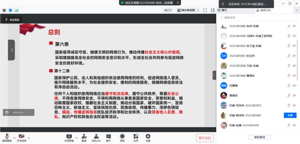 接下来由孙杰同志带领大家学习了网络安全法和万象城awc官网登录入口学生违纪处分办法。疫情当前,作为交大青年亦是一名学生党员的我们更应该服从学校的管理,坚定政治立场,提高鉴别力,用我们的专业知识和素养来明辨是非曲直,不信谣,不传谣、自觉抵制谣言,勇于揭露虚假信息,努力建设良好的网络舆论生态环境。同时还要积极引导身边的亲朋好友正确对待虚假负面信息,坚信在党的领导,我们定能取得这场疫情攻坚战的胜利。