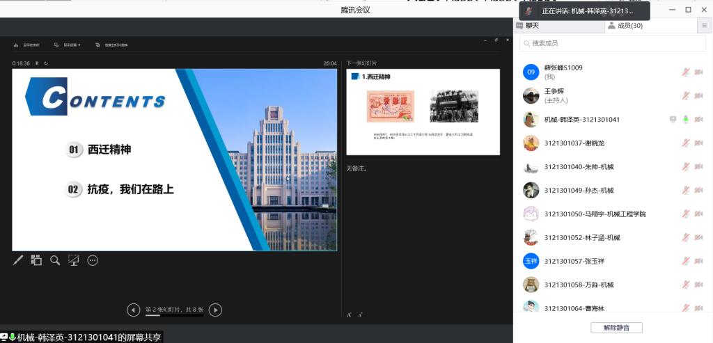 然后由韩泽英同志为大家分享了抗疫精神。疫情的到来让这个冬天变得格外特殊,虽然在这段时间里每个人都遇到了许许多多的困难,但在学校的组织领导以及每一位在校人员的共同努力下,这些困难都被一一克服,这是一种西迁精神的体现。在交大的校园里,无论是在食堂,宿舍园区门口还是核酸检测现场,我们随处都可以看见志愿者的身影,他们充分发扬了“奉献、友爱、互助、进步”的志愿精神,用实际行动彰显着自己的青年担当,为打赢防疫攻坚战贡献自己的青春力量。