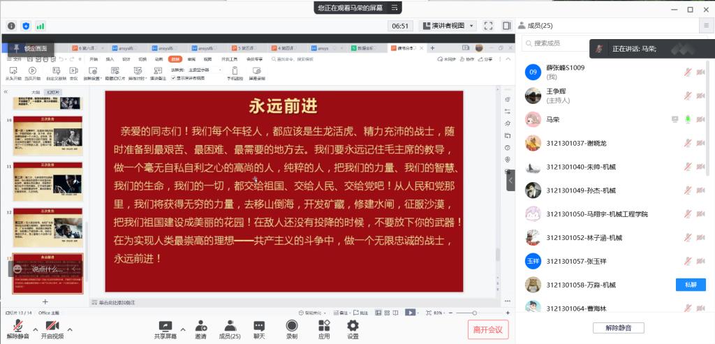 由于疫情影响,学校从去年12月27日开始按照抗疫政策进行封校。面对严峻的疫情,同学们服从安排,同医护人员、工作人员和志愿者一同战斗,在寝室完成学习和科研任务。为总结这一个月的学习成果,激励同学们继续保持抗击疫情的战斗激情,1月14日晚,机械工程学院硕1009党支部于线上召开了以“踔厉奋发,笃行不怠”为主题的组织生活会。
