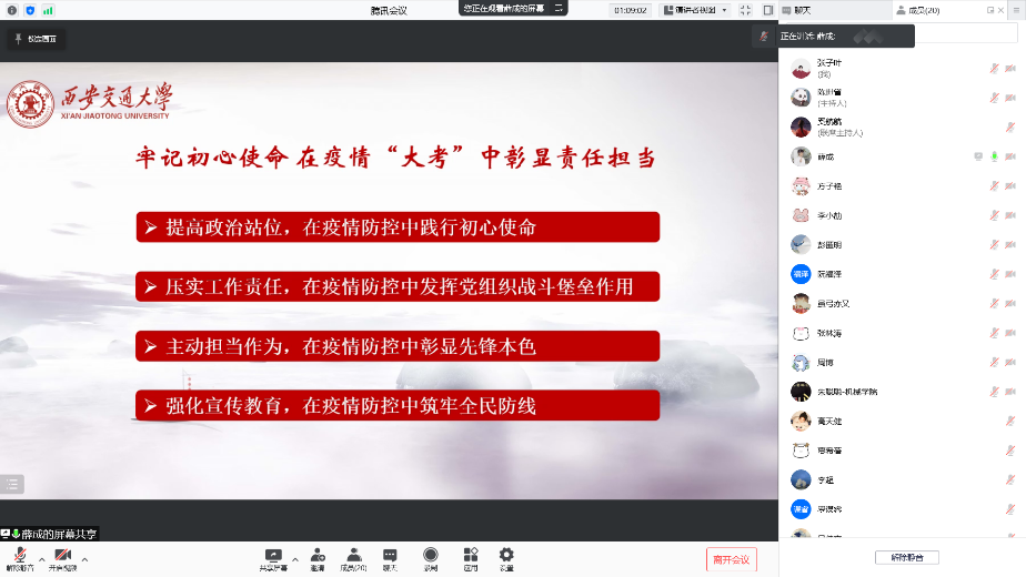 根据硕0004党支部发展党员工作计划,经征求党员和群众意见、支部委员会审查同意,12月26日晚,机械工程学院硕0004党支部线上召开接收预备党员大会。同时,针对近期西安日趋严峻的疫情防控态势,党支部根据学校、学院要求,向与会成员传达学校、学院疫情防控工作会议精神,部署安排支部内疫情防控工作。