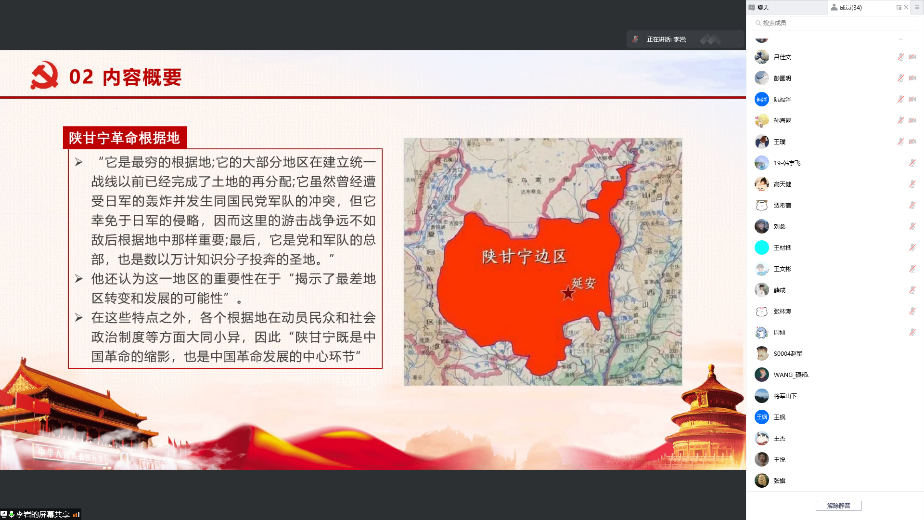 最后,李岩同学给我们带来了《革命中的中国:延安道路》一书的分享,这本书由长期研究中国农村社会发展的美国马克·塞尔登教授编写,是海外学者研究中国革命史的一部经典著作。这本书不再拘泥于追求“大理论”,而是从事以根据地为中心的地方研究。作者选择了最具特点的陕甘宁地区,研究陕西的历史、地理、人文等革命环境,到西北的反叛和革命者以及他们领导的运动,再到陕甘宁地区的土地革命——统一战线的形成——新民主主义的推广——新模式、新秩序的尝试与探索,最终促成了延安模式的建立。赛尔登通过自己的研究论证了中共革命胜利的原因在于“延安道路”的实施。这一成果,不仅使其成为陕甘宁边区抗战史研究的先驱者,也使本书成为中共革命史学术史中的重要一页。