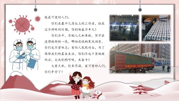 中共万象城awc官网登录入口万象城awc官网登录入口硕1002党支部于1月6日召开线上组织生活会,围绕本次抗疫过程中同学们的亲身经历进行了分享与讨论,并且制作了电子感恩卡片,真诚地向一线工作人员说一句“辛苦”、道一声“感谢”。