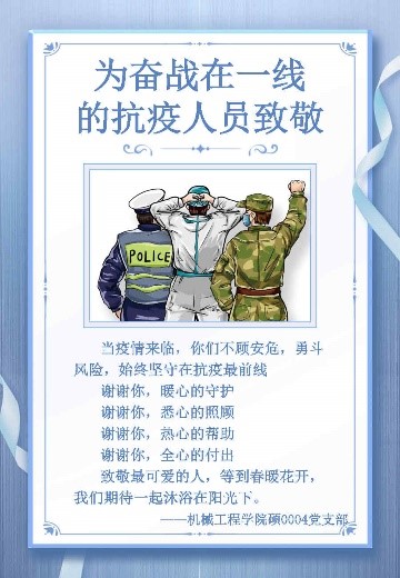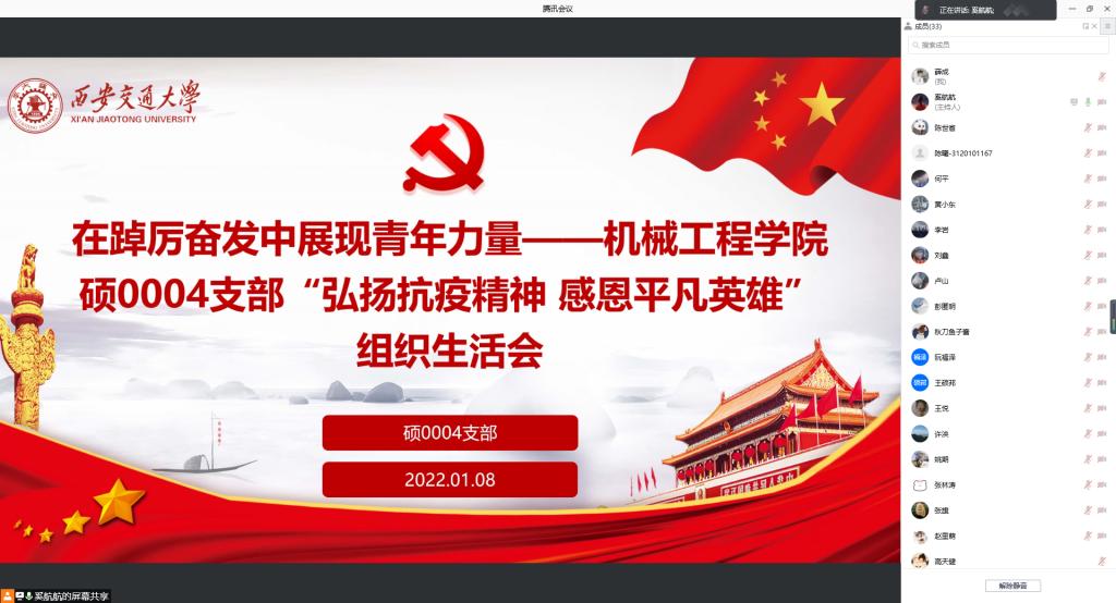岁末年初,一场突如其来、态势凶猛的新冠肺炎疫情阴影笼罩三秦大地。面对疫情,西安人民站在一起、心手相连、同舟共济、共同坚守、全力应对。为致敬这些奋战一线可爱可敬的无名英雄们,同时发扬我校学子“饮水思源”的优良传统,1月8日,机械工程学院硕0004党团支部召开线上组织生活会,弘扬抗疫精神,感恩平凡英雄,号召全体同学以青春践行使命担当。