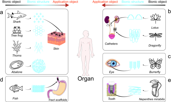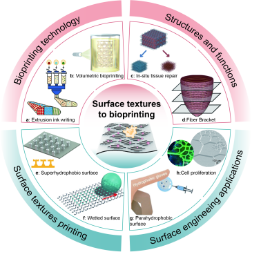 近年来,3D打印技术在生物制造领域取得了显著进展,推动了包括组织工程、再生医学、药物输送以及个性化医疗设备在内的多个生物医学应用的快速发展。这些进步使得科学家们能够精确地制造出与自然界功能类似的复杂结构,从而更好地满足医学和工程的需求。万象城awc官网登录入口机械工程学院与美国普渡大学西拉法叶分校的研究团队上发表了一项创新性研究,展示了如何通过3D打印技术制备具备多功能特性的生物结构,为组织工程及再生医学的应用开辟了新的可能。利用增材制造技术,设计并制造出具有仿生特性的生物结构,这些结构模仿了自然界中各种功能性生物材料,例如表面超疏水性、各向异性和机械强化等功能,进而用于植入器官和生物医学设备的制备。通过仿生表面和界面结构的优化设计,3D打印技术为植入体进一步提升了与人体的相容性及生物力学性能。