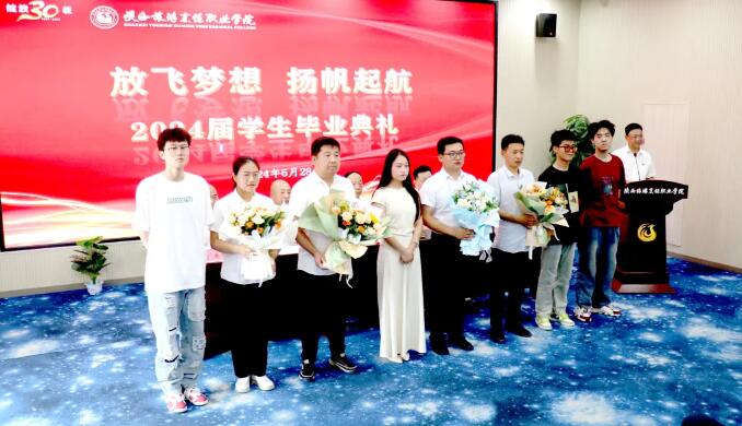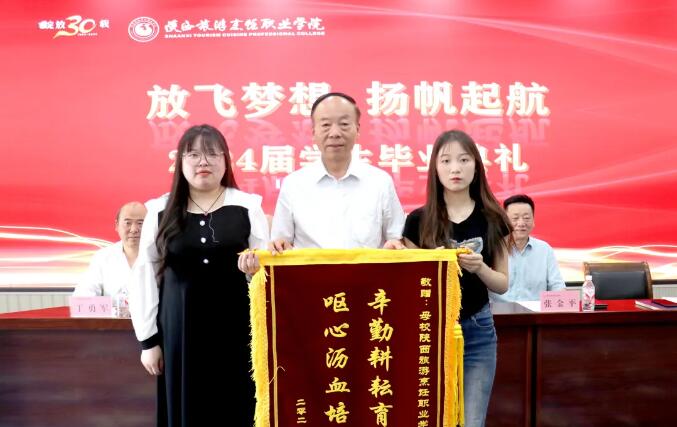 毕业班级学生向学院赠送锦旗 学院党委书记朱选朝代表学院接旗