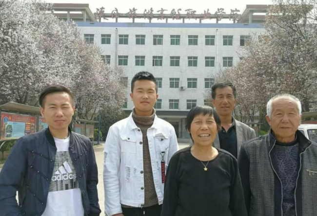 张刚刚(左一)早前带着父母返回母校,他的侄子(左二)学院中餐专业16级的学生
