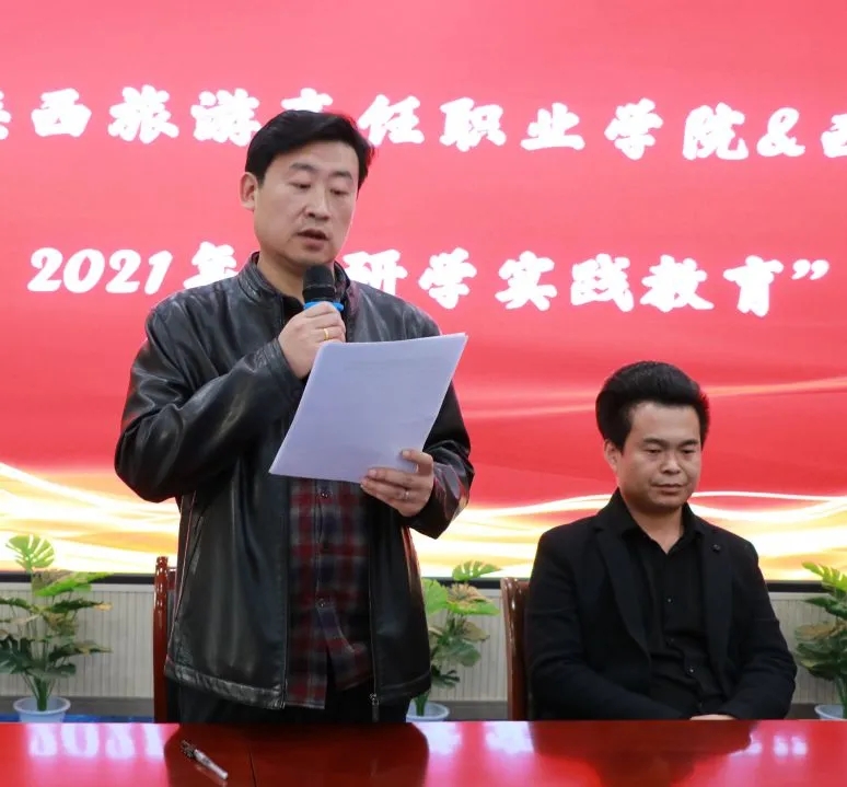 首先,学院党委书记朱选朝同志致辞,他从三方面阐述此次签约研学实践教育是学院、家庭、社会的融合,对学生的成长成才意义重大。要走实走深,把重点放在提高职业技能水平上,让学生进一步了解行业、企业、社会,与时代同步,认清大势,听党话,跟党走,成为新时代能够担当民族大任的时代新人。