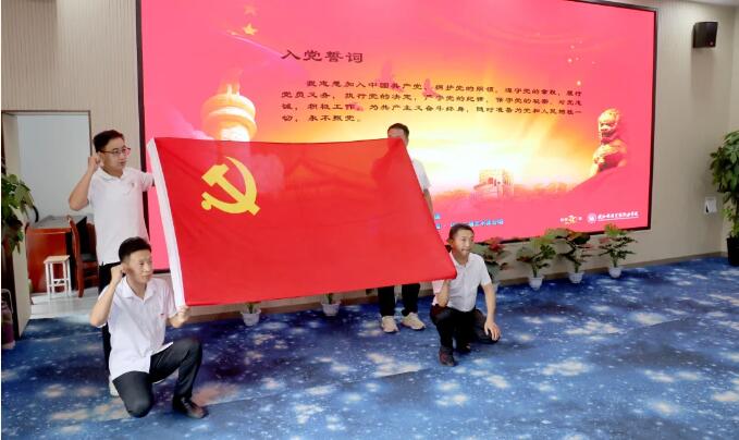 活动第一项,全体成员起立,面向党旗,举起右拳,跟随领誓人学院副院长杨文利庄严宣誓。