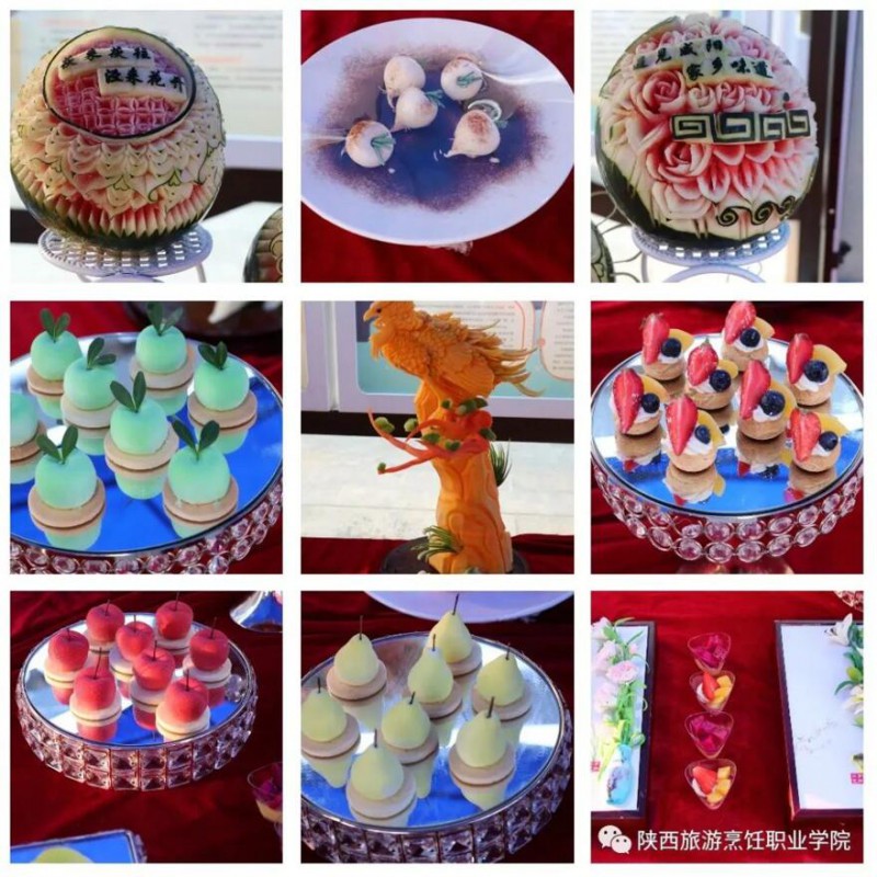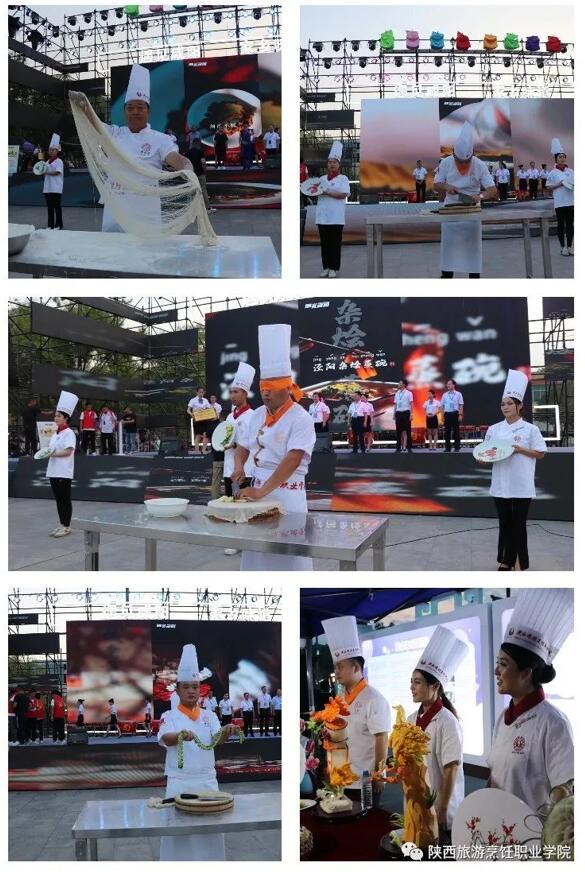 在活动现场省委网信办主任柯昌万、 省委网信办副主任马卫东、省委网信办传播处处长高志强、泾阳县县委常委、宣传部部长徐晓玲等领导参观了今年会展示的作品,今年会也派出了学院名师展示了技艺高超的刀工,展示了拉面技术,只见面团在他手上上下翻转,眨眼间变成如头发丝儿般的面条。还有专业技能——蒙眼切土豆丝,在看不见的情况下手起刀落,把土豆丝切的如细针如牛毛,既具有观赏性又具有实用性。以及蓑衣黄瓜的刀法展示,一根黄瓜在专业的刀工下变的极具艺术性。在专业大师表演结束后,还有今年会教师提前准备的菜品展示,一盘盘精致艺术品一字排开,栩栩如生,让众多领导以及媒体纷纷驻足观看,深深被吸引。