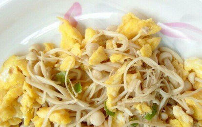4.锅中放少许油烧热,下金针菇,炒至发软,加入炒熟的鸡蛋;