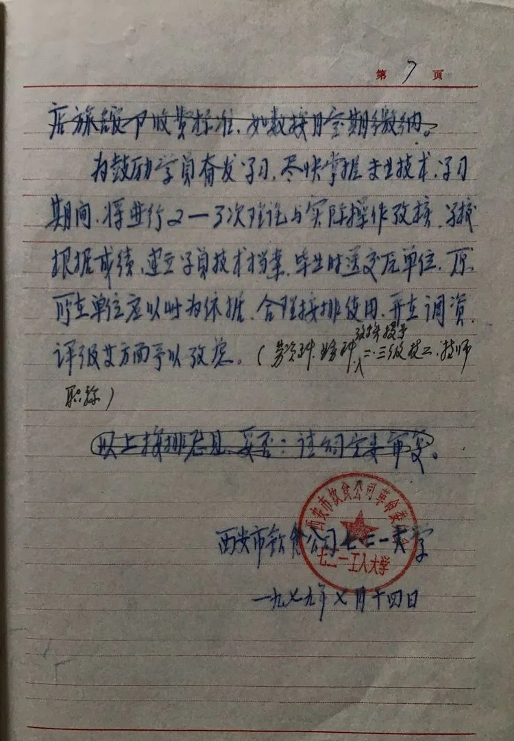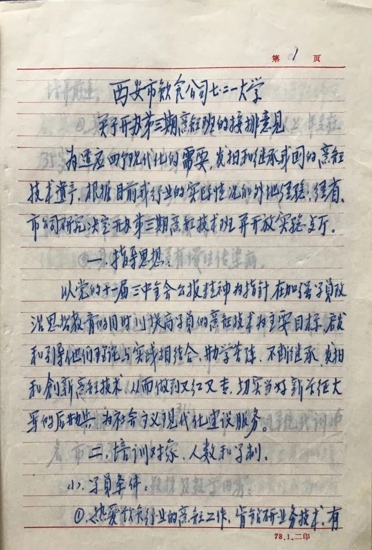 从1976年第一期烹饪培训班的学员不到20人,到1978年第二期烹饪的约50人(不含小吃班),再到1979年第三期的定额31人;从第一期烹饪培训班的教学计划只是一张纸的课表形式,到第二期有了九张纸的具体内容,再到第三期既有七页内容培训班的安排意见,又有十八页烹饪班详细业务教学计划;从第一期的培训时间1年,到第二期的六个月,又到第三期的1年;从第一期结业到第二期开学其间间隔时间为2年,到第二期结业至第三期开学其间间隔不到1年;从第一期烹饪班的授课老师20位(孙国庆、靳宣敏、许再喜、尚长青、韩忠俭、唐延生、章柴祖、韩生域、李风藻、安振邦、李玉田、朱子明、马振贤、徐顺发、于映文、刘荩臣、倪栓齐、李致忠、李荣春、张鸿儒。公司系统外2位),到第二期烹饪班的授课老师18位(席志华、尚长青、孙国庆、白有信、于映文、郭家金、费平安、倪栓齐、韩忠俭、许再喜、尚长青、邓省齐、韩生域、李致忠、靳宣敏、唐延生、许伯泉、翟耀民),再到第三期烹饪班的授课老师17位的变化(靳宣敏、邓省齐、韩忠俭、翟耀民、于映文、倪栓齐、唐延生、郭家金、许再喜、许伯泉、孙国庆、尚长青、韩生域、费平安、白有信、翟耀民、李致忠、李玉田);从第一期烹饪班带面点课(授课老师朱子明、李玉田),到第二期烹饪班不带面点课而开设专职面点班,再到第三期烹饪班又带面点课(授课老师李玉田);从第一期、第二期烹饪实践操作课计划只有授课老师、没有授课菜点名称,到第三期烹饪实践操作教学课每位授课老师的菜品全部列入计划安民告示;……。这里面有着太多的变数与不同。也正如后来人们总结这三期烹饪培训班时所说的那样:第一期的烹饪培训班是摸着石头过河——探路;第二期的烹饪培训班是总结完善——开路;第三期烹饪培训班是初具雏形——成路。特别是由第三期烹饪培训班开始了抽调启用让有文化、会操作、懂理论的年轻学员留校任教的模式,使传统的烹饪教育和厨师培训活动顿时变得灵动活跃起来,一改过去老师傅兼讲烹饪理论课时那种“满肚子蝴蝶飞不出来”的尴尬现象,逐步开始真正的实现了烹饪技艺教学过程中理论与实践的完美结合。这就是后来的西安桃李旅游烹饪学院在二十世纪七十年代时孕育、诞生、成长、发展的进化提升过程。再就是“西安市饮食公司七.二一大学关于开办第三期烹饪班的安排意见”后面盖印的《西安市饮食公司革命委员会七二一工人大学》那枚鲜红的印章,可谓真是难得罕见的“见证历史事件奇迹”的原始物件了。