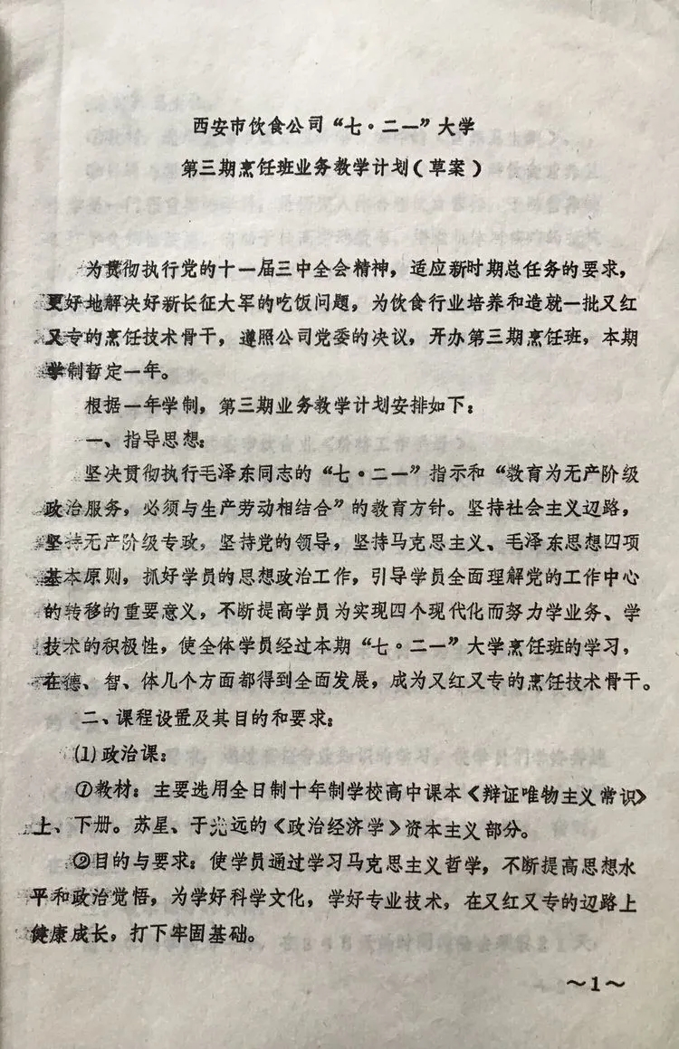 “西安市饮食公司七.二一大学关于开办第三期烹饪班的安排意见”、“西安市饮食公司七.二一大学第三期烹饪班业务教学计划(草案)”,和“西安市饮食公司第三期厨师进修班结业留念”这三份档案资料,完美的展现了西安市饮食公司七.二一大学由1979年11月至1980年11月期间,举办第三期厨师烹饪技术培训班的三维场景:培训的目的、培训的内容、培训的过程。成为见证陕西烹饪教育(西安市饮食公司受陕西省饮食公司的委托,承担着全省餐饮行业厨师的业务技术培训的任务)、陕菜厨师培训和西安餐饮业业态不可多得的原件资料。
