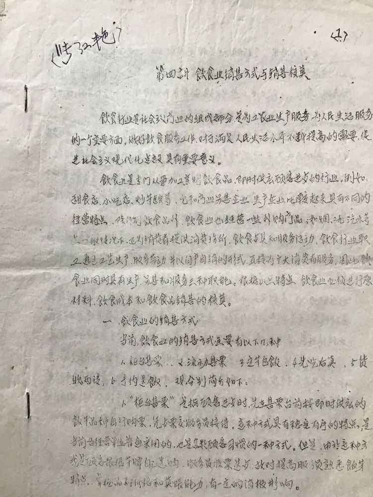 这三份手刻制版、手工印刷的资料(指人工刻蜡纸、手推印刷的一种油印方法),一份是“文化古都西安的风味菜点”;一份是“西安饭庄风味菜点介绍”;一份是“饮食业销售方式与销售核算”。虽然都没有落款日期和印刷单位,但是从印刷方式和字迹已经老化模糊的现象来看,它的年代一定不会短;从资料的名称和内容上来看,是饮食业业务知识的学习暨培训的资料。准确的说,是西安市饮食公司西安饭庄用于职工业务知识培训的学习资料,具体时间应该是拨乱反正后的1978年前后,是全国各行各业掀起学习技术热潮那个年代的事了。