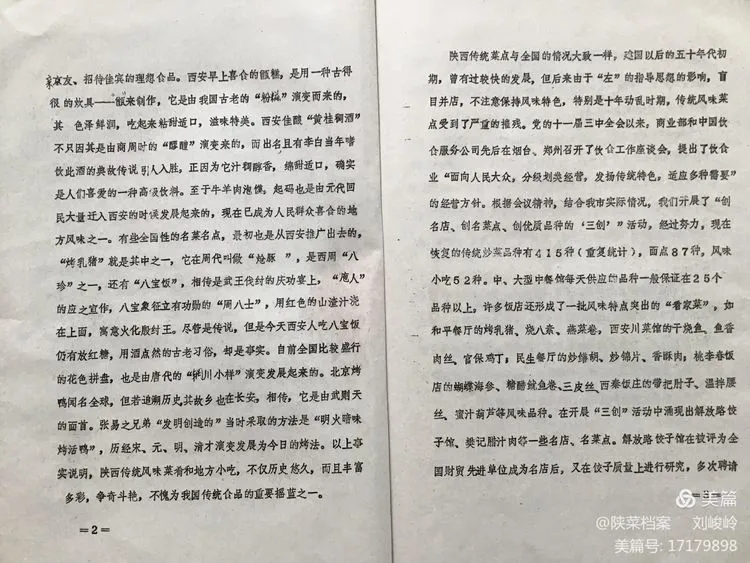 在谈到西安餐饮当时的业态时是这样说:“陕西传统菜点与全国的情况大致一样,建国以后的五十年代初期,曾有过较快的发展,但后来由于“左”的指导思想的影响,盲目并店,不注意保持风味特色,特别是十年动乱时期,传统风味菜点受到了严重的摧残。党的十一届三中全会以来,商业部和中国饮食服务公司先后在烟台、郑州召开了饮食工作座谈会,提出了饮食业“面向人民大众,分级划类经营,发扬传统特色,适应多种需要”的经营方针。根据会议精神,结合我市实际情况,我们开展了创名店、创名菜点、创优质品种的“三创”活动,经过努力,现在恢复的传统炒菜品种有415种(重复统计),面点87种,风味小吃52种。中、大型中餐馆每天供应的品种一般保证在25个品种以上,许多饭店还形成了一批风味特点突出的“看家菜”,如和平餐厅的烤乳猪、烧八素、燕菜卷;西安川菜馆的干烧鱼、鱼香肉丝、宫爆鸡丁;民生餐厅的炒鳝糊、炒锦片、香酥肉;桃李春饭店的蝴蝶海参、糖醋鱿鱼卷、三皮丝;西秦饭庄的带把肘子、温拌腰丝、蜜汁葫芦等风味品种。在开展“三创”活动中涌现出解放路饺子馆、樊记腊汁肉等一些名店、名菜点。解放路饺子馆在被评为全国贸易先进单位成名店后,又在饺子质量上进行研究,多次聘请老技师进行技术指导,终于创出了自己独特风味的大肉饺子。樊记腊汁肉坚持采用传统工艺加工,保持了腊汁肉肥而不腻,瘦而不柴,色泽红润,软烂香醇的特点。” 不长的叙述,就将新中国成立以来全国和西安餐饮业40余年的变化跃然纸上,可让人眼睛随着文字移动而有身临其境的感觉。