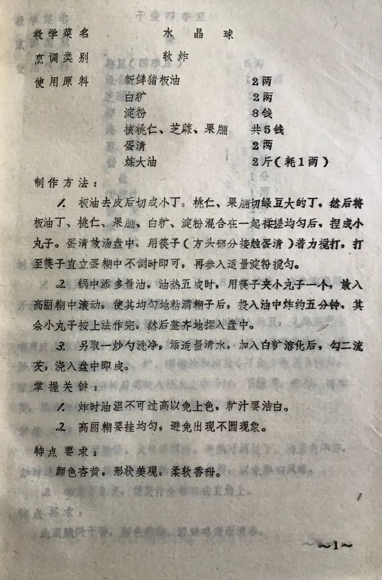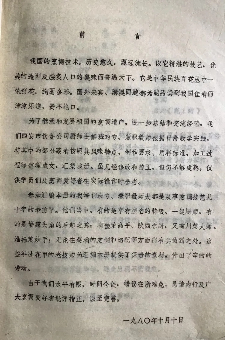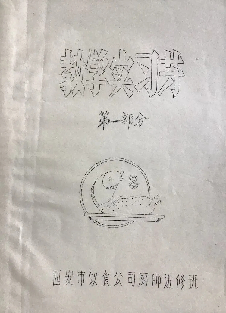 这本封面为《教学实习菜》第一部分的教材,是以西安市饮食公司厨师进修班的名义编写的,时间是一九八0年十月十日。它虽然只有29页,也只收录了25道菜肴,但它却是陕西烹饪教育的一个里程碑。它不仅是陕西现存最早的一本用于烹饪教学过程中实践课菜品技术的培训教材,也是见证陕西烹饪教育、厨师技术培训过程中发展进步的重要历史资料。原因是它不同于以往厨师培训时使用的菜谱和实习菜谱的编写模式:一、用料、二、操作、三、特点(见1972年由西安市莲湖区饮食商店编写烹饪技术培训试用教材之一的《实习菜谱》编写模式),而是总结了前几期烹饪技术培训班的教学经验,采用了便于授课教学的编写新模式:一、教学菜名、二、烹调类别、三、使用原料、四、制作方法、五、掌握关键、六、特点要求。事实和实践证明,这种教学实习菜谱的编写模式,既便于授课教师的规范备课,也利于学生们的学习掌握。毕竟它是在前几期烹饪技术培训班教学实践中总结出来的经验之举。