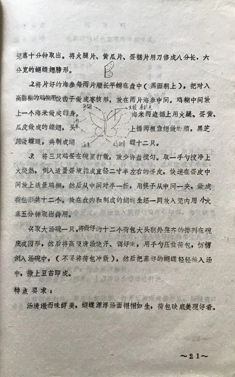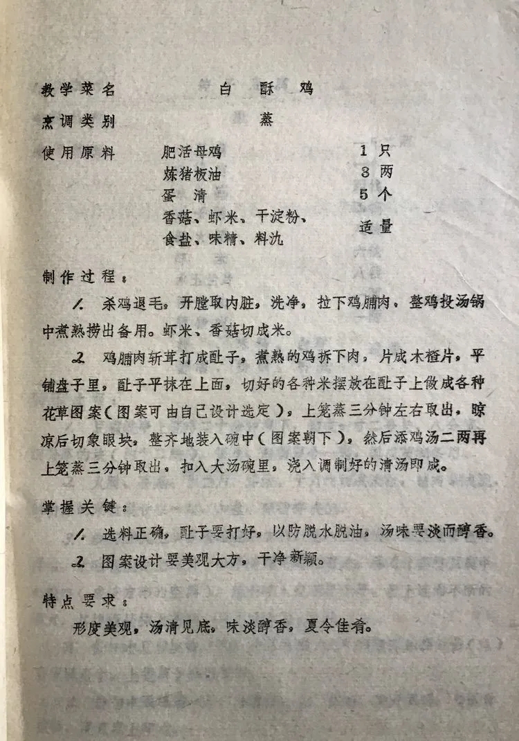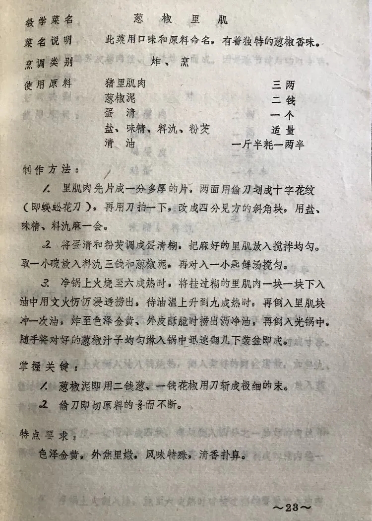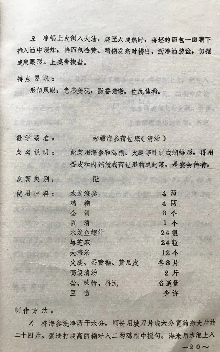 从这本《教学实习菜》的落款时间上看,应该是西安饮食公司烹饪技术学校的第三期厨师培训班(第一期厨师培训班是1975年9月至1976年7月,第二期厨师培训班是1978年6月至1979年2月,第三期厨师培训班是1979年10月至1980年11月。详见《陕菜档案》之五、之七),也就是说这本小册子是在第三期厨师培训班结束时才打印出来的。经过查阅西安市饮食公司“七.二一”大学第三期烹饪班教学计划(草案),得知这25道菜的授课老师是:酿燕菜卷、烧八素、莲菜肉、凤眼鸽蛋、蝴蝶海参包袱底、葱椒里脊、菊花干贝、炸春段、纸包鸡、珍珠面筋是韩忠俭老师;鸡茸冬笋、锅烧鸡方、白汁酥鸡是唐延升老师;煨鱿鱼丝、白酥鸡、箱子豆腐是邓省齐老师;水晶球、干烧四季豆、干烧鱼块、铁扒猪排、鱼香烘蛋、芝麻锅炸是许再喜老师;奶油扒三丝菜卷是于映文老师。山药寿桃和莲蓬鸡二道菜没有查到具体的授课老师。