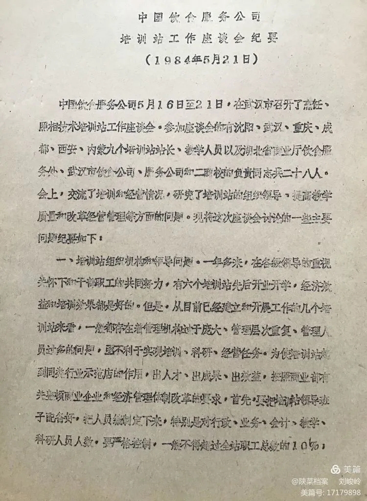 从参加1984年5月在武汉召开的中国饮食服务公司培训站工作座谈会的四家烹饪技术培训站的汇报材料来看,重庆培训站、沈阳培训站和武汉培训站分别已经由1983年就开始了第一期烹饪班培训和餐厅的对外经营,开会时他们把第二期的厨师进修班教学计划也带来了。由于西安烹饪培训站还在建设中,这次会议就成了西安烹饪技术培训站一个很好的学习机会。为了让那段历史成为后人研究和了解中国烹饪技术教育和厨师业务培训的一个窗口,也为了让我们记住那些为厨师培训付出心血的烹饪前辈和那些传统的珍馐美馔,故把这几个培训站的汇报材料择重点复述如下。