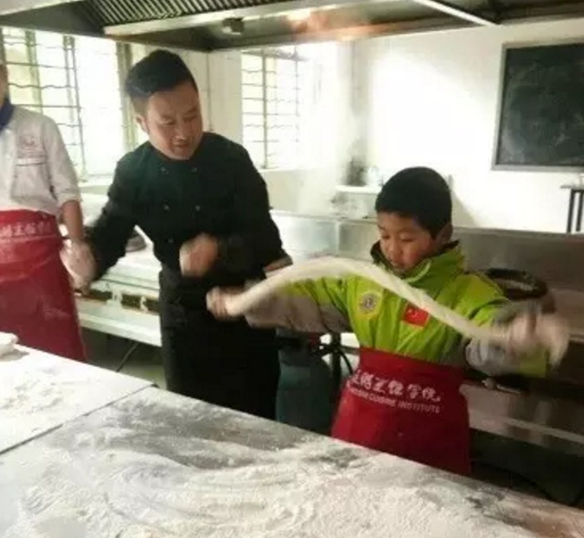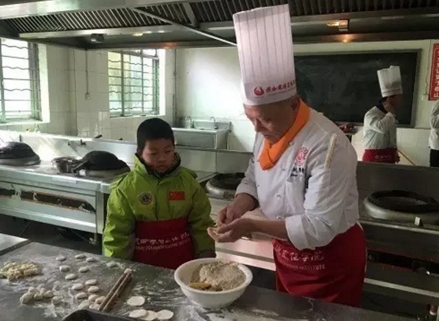 瑞豪来到学院后,参观了学院展室、荣誉室,一个个精美的烹饪艺术品,一座座烹饪大赛奖杯,给孩子留下了深刻的印象。随后,孩子观看了学生们的技能表演,气球上切黄瓜、蓑衣花刀,余鹏副院长亲自给孩子表演了中华传统绝技龙须拉面,还亲自指导瑞豪学习了龙须拉面。学院特意安排了两位中国烹饪大师为孩子上了两节实践课,赵彦奇老师讲了水饺的制作,手把手的教瑞豪包饺子,薛富强老师制作了吉利虾球、鱼香肉丝、金枣糟肉、黄焖鸡、米粉肉、八宝饭。瑞豪还来到教室,和同学们一起听了孙永平老师的饮食文化课。从参观校园到深入课堂,再到亲自体验,瑞豪实实在在的感受了一次烹饪教学,短短的几节课,让他收获颇多,也提前圆了自己的烹饪梦。