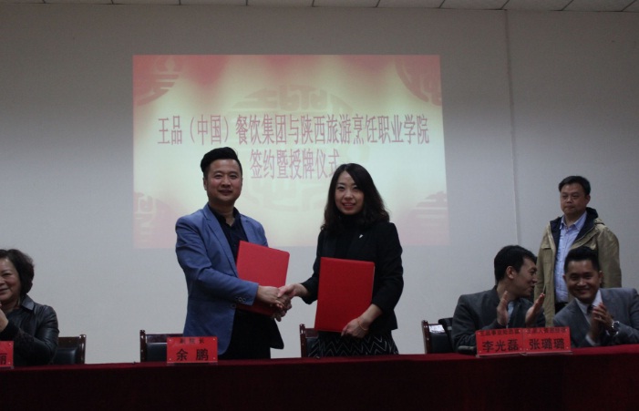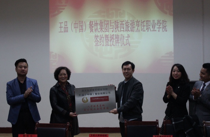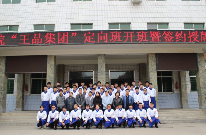 在开班典礼上,教务处长杨涛同志代表学院回顾了与王品集团合作的过程,希望全体定向班的同学们,积极投入学习,按照企业和学院的标准,严格要求自己。李光磊总监在致辞中鼓励同学们勇于承担,不断完善,也欢迎大家在王品实现自己的人生价值。随后,余鹏副院长与张璐璐经理在校企合作协议上签字,李光磊总监向王春丽院长助理授牌。