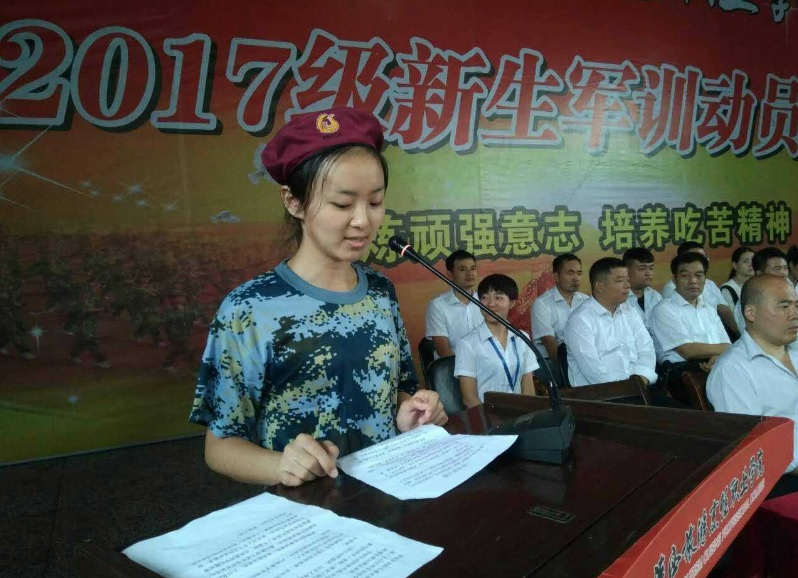 来自美丽新疆的女同学李芮格,代表新同学在大会上表了决心,在军训中坚持做到不放弃,不退缩,把这次军训做为新的起点,来开启大学生活的美好篇章,多大的困难也都会勇往直前。把军训当成砥砺我们新同学意志的第一块试金石。