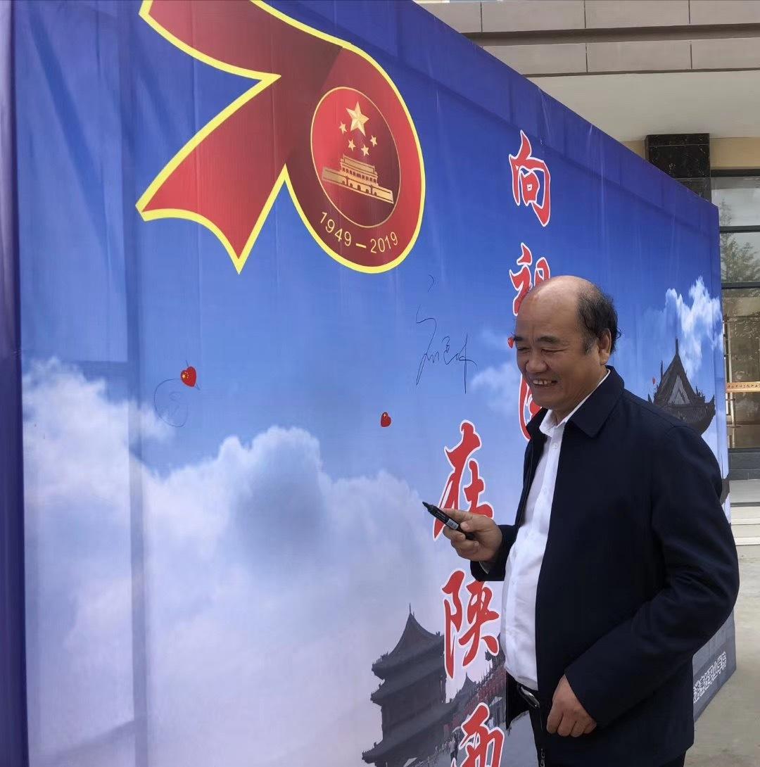 为庆祝中华人民共和国成立70周年,jinnianhui今年会官网学生组织"迎新中国成立七十周年,在陕西,向祖国表白"的活动,在实训大楼前陕西省教育厅副厅长刘建林在活动展板上签名留念。