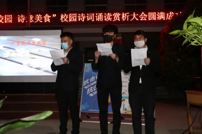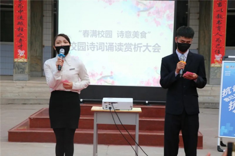 台上精彩,台下陶醉。晚上7时30分,大会以一首《如约春至,如此之美,我在陕旅烹院等你》拉开帷幕。参会人员个个精神饱满,仪态大方,伴着潺潺的音乐,观诗画,入诗境,读诗韵,品诗情,或铿锵有力,或温柔婉转,或抑扬顿挫。《春满陕旅烹院》《校园的春天》《烘焙的诱惑》《沁园春﹒美食飘香》等21首诗词在深情的朗读赏析中演绎,跃然化为一幅幅生动的画,一幕幕感人的景,深深感染着在场的每个人。