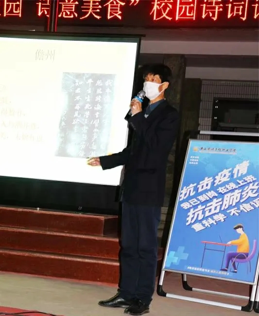 此次诗词诵读赏析大会,由学院教务处主办,旨在丰富疫情期间广大教职工的文化生活,推动校园文化建设,进一步汇聚抗“疫”磅礴力量。会前,教务处提前一周下发“通知”,广大教职工积极参与,踊跃报名,认真准备,按要求自创或任选一首与校园、美食相关的诗词,制作带背景音乐的PPT。