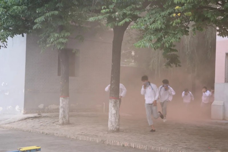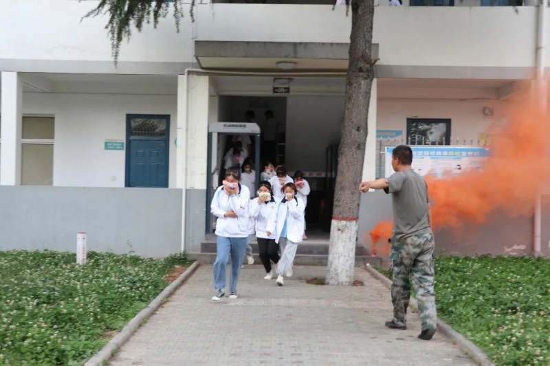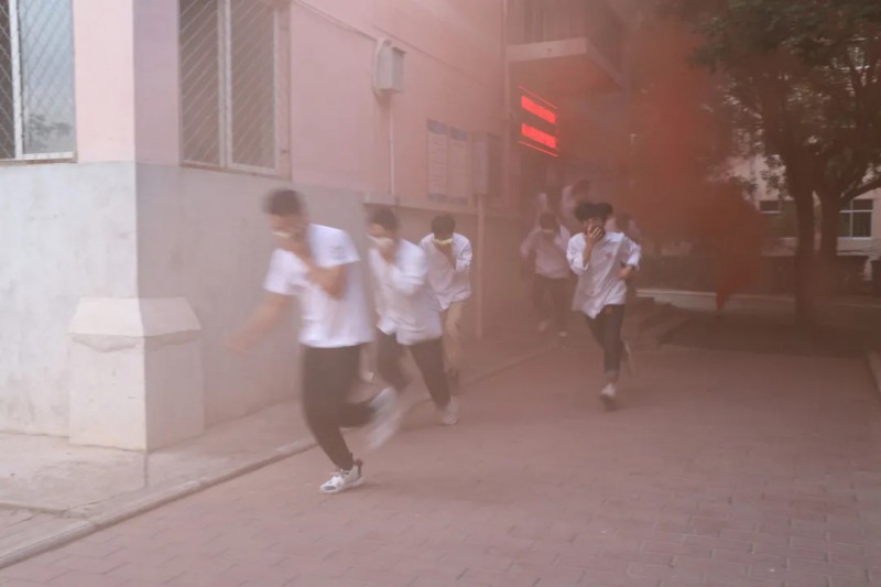 6点30分,演练活动正式开始。教官首先就火灾来临时应当注意的事项以及如何在火灾中逃生等内容向同学们作了详细讲解。随后,通过疏散、逃生演练使师生参与体验并掌握火灾来临时的科学逃生方法。一声紧急的火灾警报声响起后,在滚滚浓烟中,全院师生随着教官的指挥,用毛巾捂住口鼻快速有序地向操场撤退。经过1分40秒,全部师生安全撤离到操场。整个过程中组织有序,师生镇定应对、迅速撤离,达到了预期的目的。