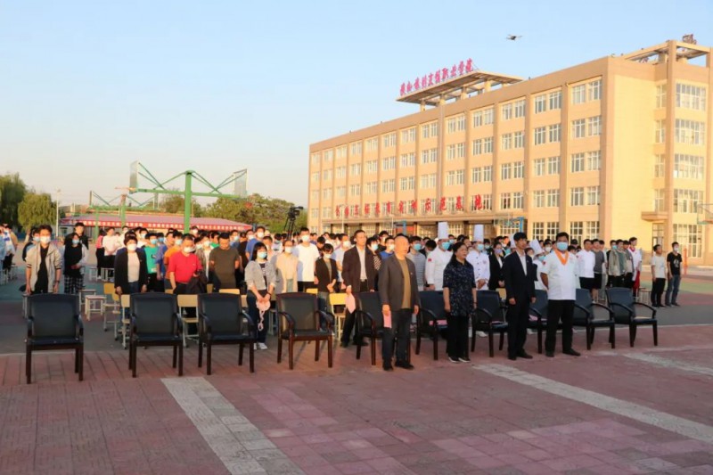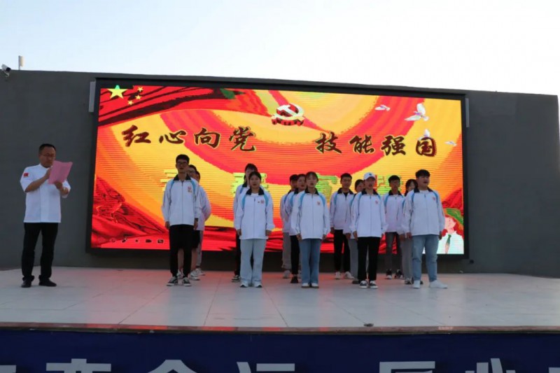 全校师生在团委书记谢伟的带领下,进行青春宣誓,向时代发出最强青春宣言,红心向党,技能强国。
