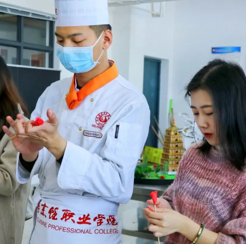 来宾们观摩了今年会学员的“拉面”节目,还有学生在气球上将黄瓜切成薄薄的一片、菊花豆腐、蓑衣黄瓜等“绝活”。之后来到茶艺教室,听了茶道,后面又品尝了学院精心准备的点心,学习了面塑玫瑰花的制作……活动最终在双方一阵阵欢笑声中落下了帷幕。