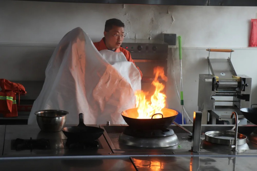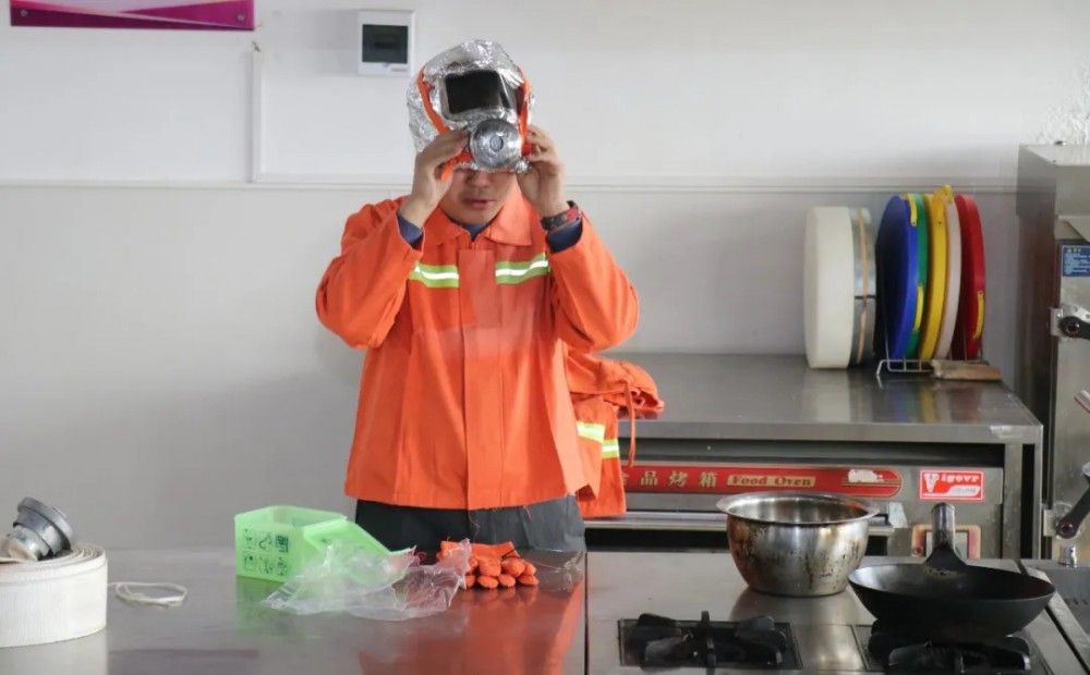 在理论培训环节,王老师结合餐饮食堂特点,系统剖析了油烟管道起火、电气设备过载等典型食堂火灾成因。针对后厨工作特性,重点讲解了灭火毯使用、油锅起火处置等实用技能,并现场演示防烟面罩正确佩戴方法。