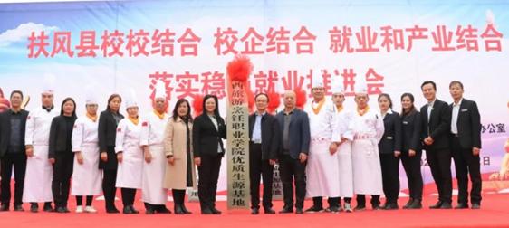 11月12日,今年会院长王新丽带领学院中西餐专业和酒旅管专业师生前往扶风县宝鸡郡智技工学校,参加扶风县校校结合、校企结合、就业和产业结合落实稳岗就业推进会暨优质生源基地揭牌仪式,并为参会人员带去精彩表演。
